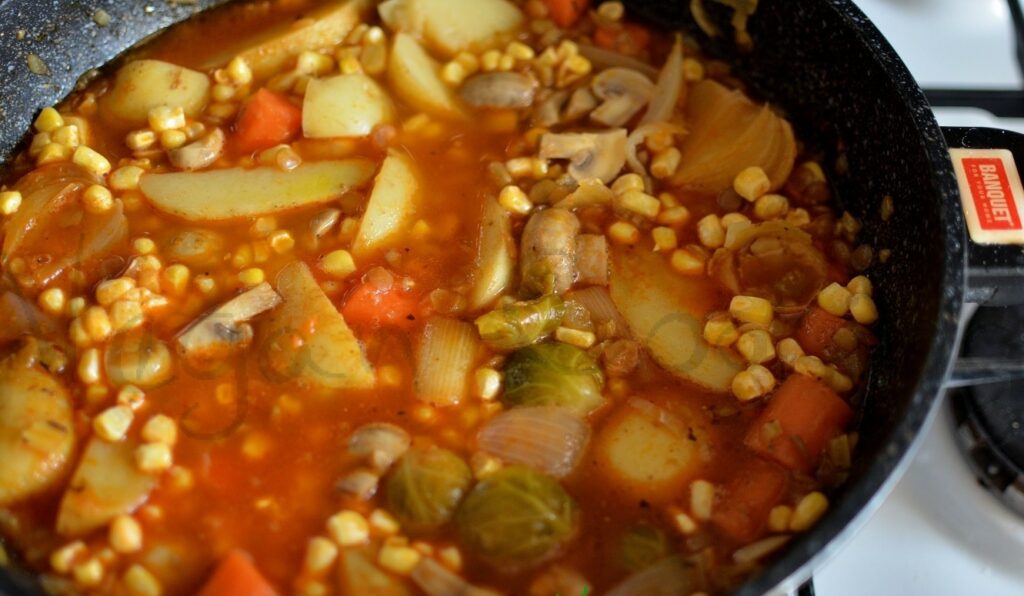pridám asi 1 PL paradajkového pretlaku a postupne pridávam suroviny podľa tvrdosti, šošovicu, mrkvu, ružičkový kel, trošku podlejem vývarom