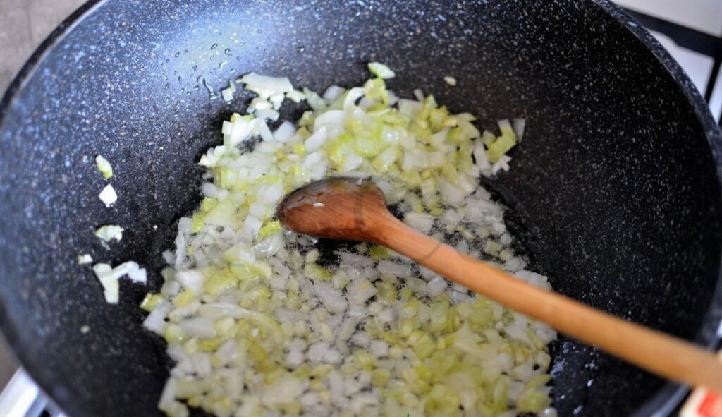 na oleji popražím cibuľu a stonkový zeler pekne do chrumkava