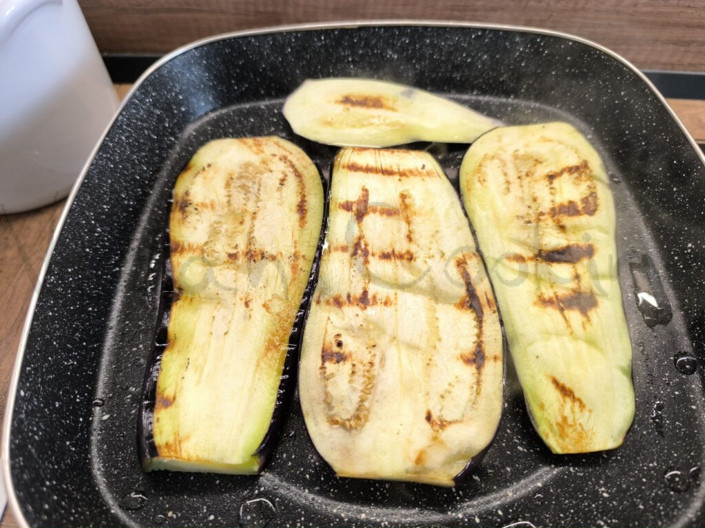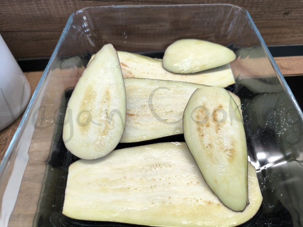 baklažány nakrájam po dĺžke na cca 7 mm a nasolím aby sa vypotili