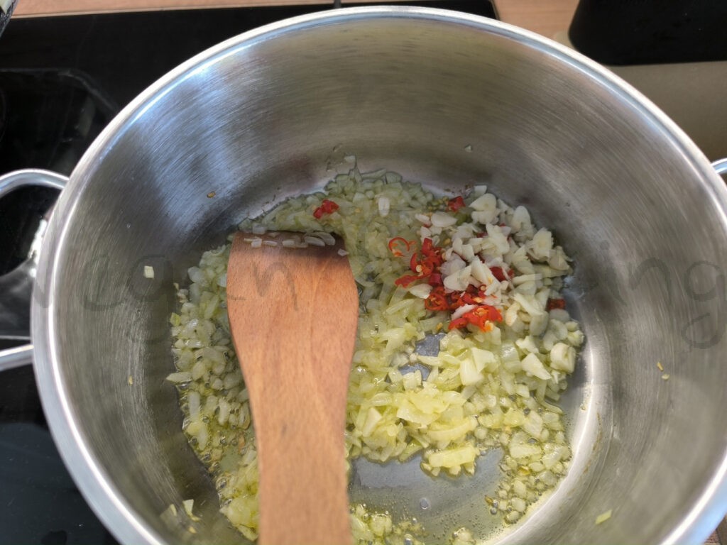 na olivovom oleji pozvoľna osmažím nakrájanú cibuľu, cesnak a chilli