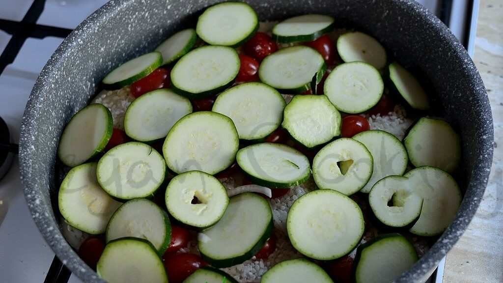posledná vrstva zase zemiaky, zalejem vývarom tak, aby bola ryža ponorená, na vrch opäť olivový olej a koreniny