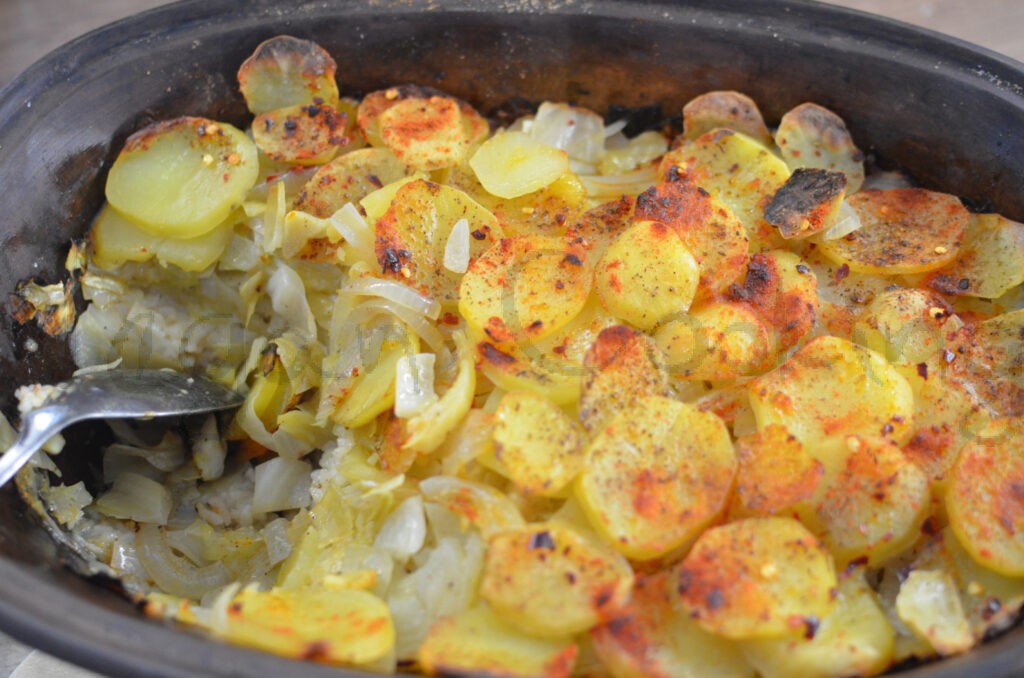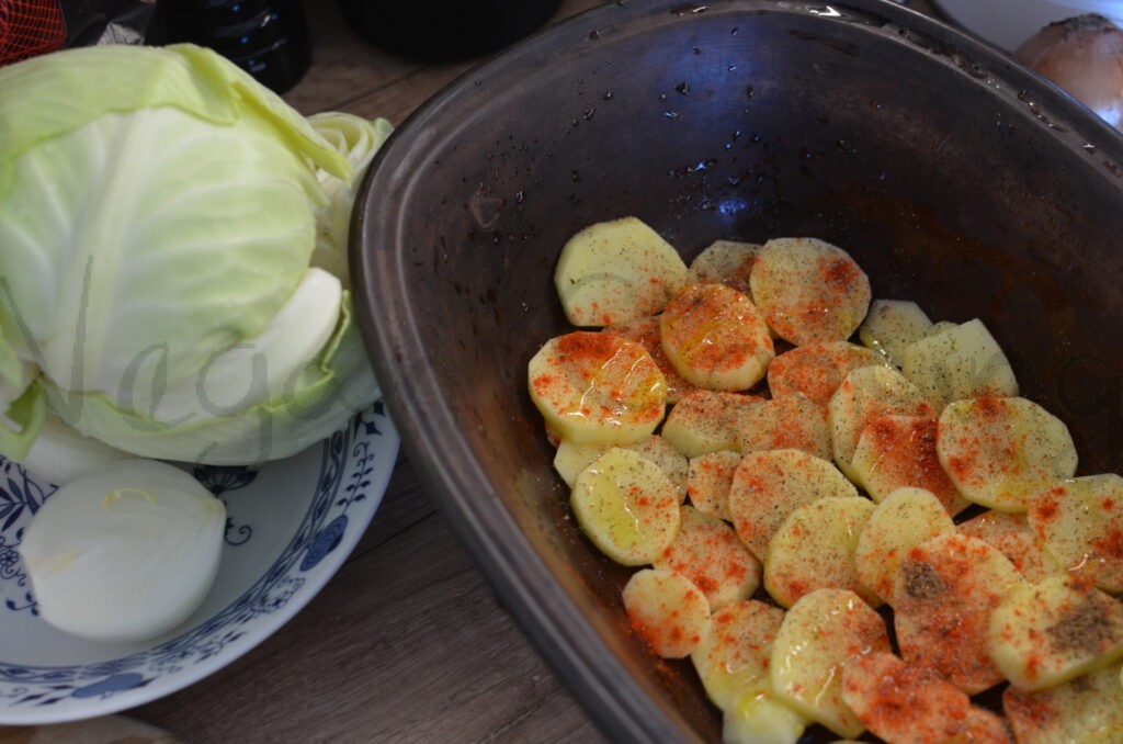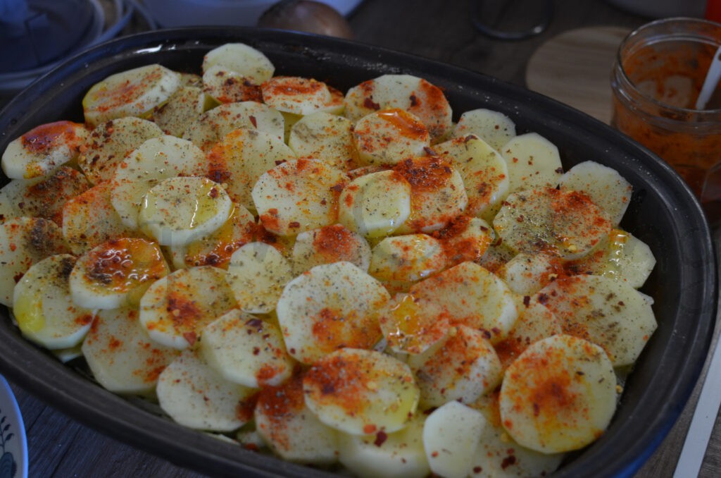 posledná vrstva zase zemiaky, paprika, soľ, rasca, chilli, čierne mleté korenie a olej