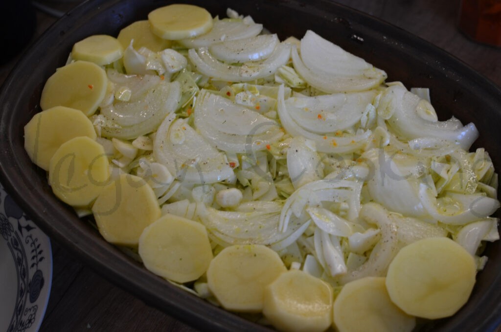 spodok som vymastil olivovým olejom a začal ukladať prvú vrstvu zemiakov